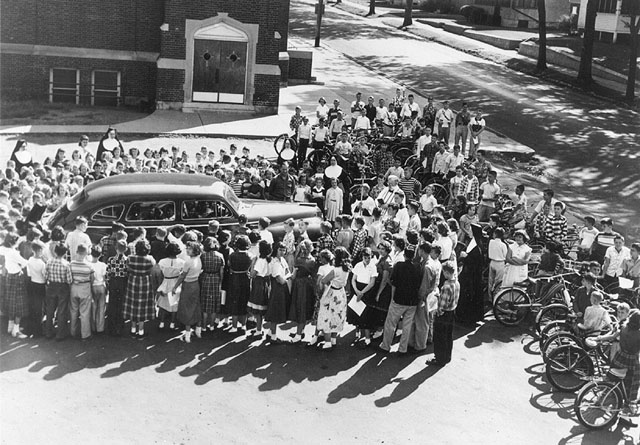 St. John's car and students' bicycles in 1952. The man on the